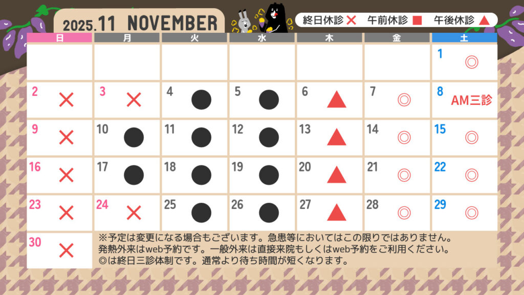 11月6日(木)愛甲医師の診療は12時までです。ご希望の方はお早めにご来院お願いいたします。